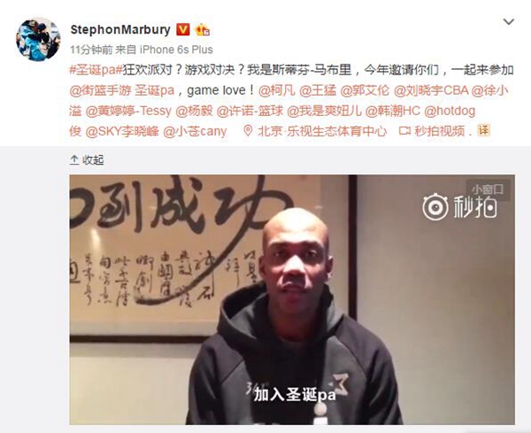 12月13日,距离2016年圣诞节还有2周不到的时间,著名篮球明星斯蒂芬-马布里在个人微博发布视频。他宣布将会携手全球首款3V3真竞技篮球手游《街篮》,打造神秘“圣诞pa”活动,同时还顽皮地邀请了王猛、柯凡、郭艾伦、刘晓宇、赵爽、许诺等一众圈内好友,吸引了广大微博球迷、玩家的关注与热议。